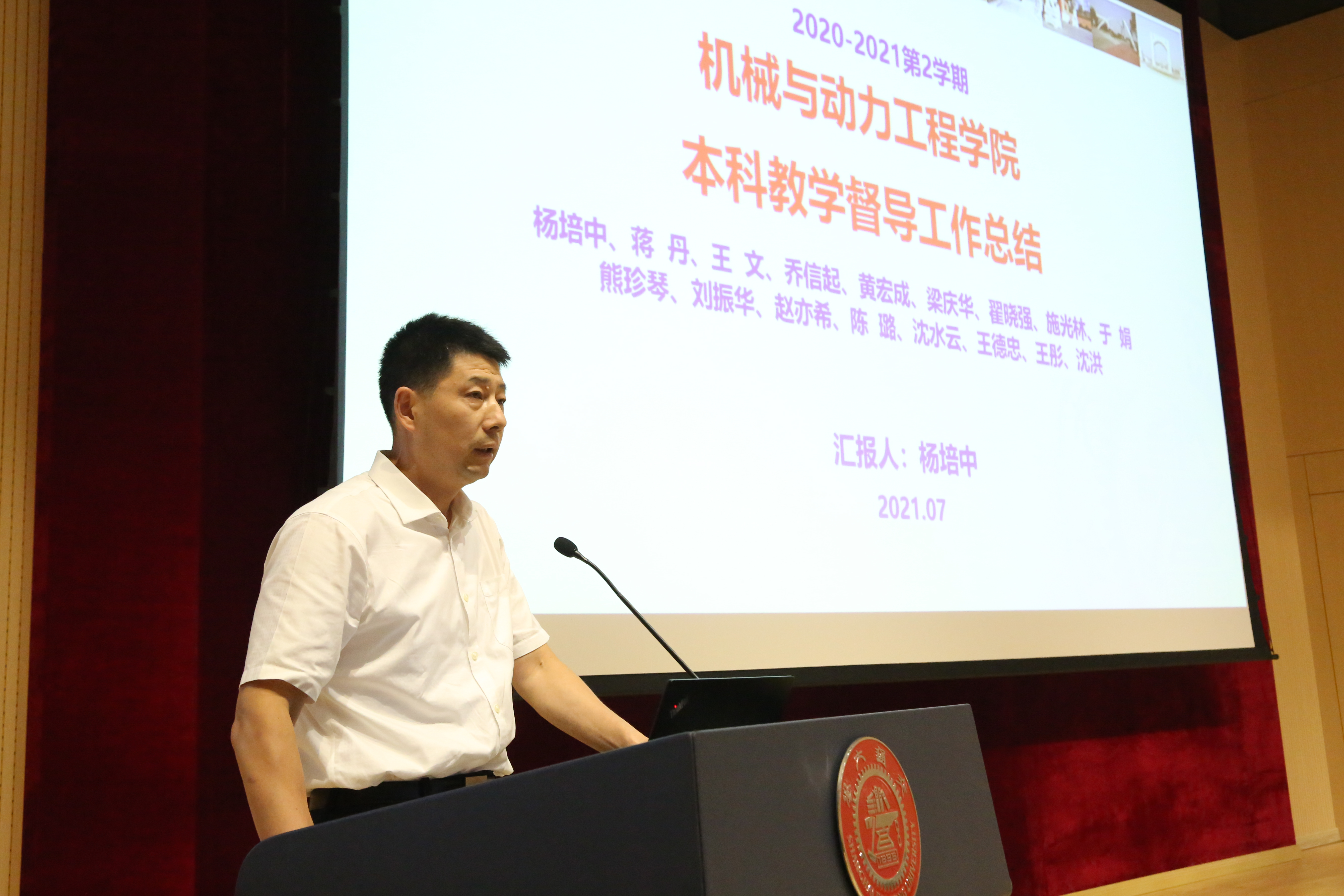 学院督导组组长杨培中从督导巡课巡考听课、毕业设计抽查、过往试卷抽查、学院课程评估、督导其他工作五个方面对本学期本科教学督导工作进行总结汇报。他具体梳理了本科教学工作中存在的问题及需重点关注事项,并针对毕业设计抽查提出改进建议。