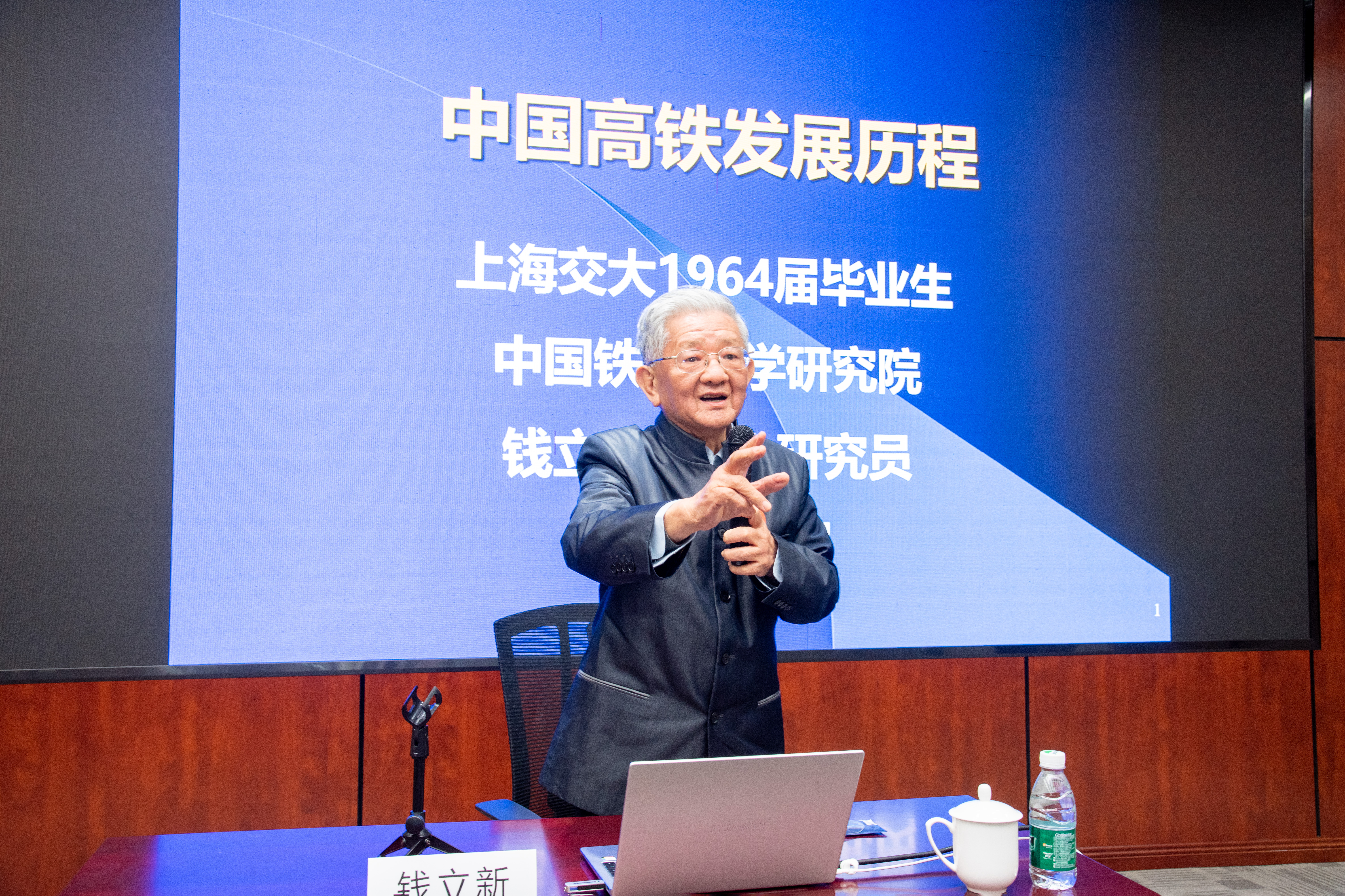 钱立新做“中国高铁的发展历程”专题报告,讲述了自己在老一辈科学家茅以升的指导下,设计制作我国第一台制动动力试验台的过程,强调自己能够在缺少制造经验、缺乏大量有用数据的条件下取得成绩,与在交大求学期间勤勉研习、打下的扎实基础密不可分。他鼓励大家要把握好在校学习的机会,不断打磨自身专业能力。