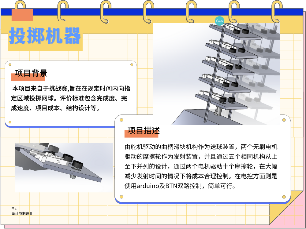 而本项目在综合考虑上述评价标准后选择使用由舵机驱动的曲柄滑块机构作为送球装置,两个无刷电机驱动的摩擦轮作为发射装置,并且通过五个相同机构从上至下并列的设计,通过两个电机驱动十个摩擦轮,在大幅减少发射时间的情况下将成本合理控制。在电控方面则是使用arduino及BTN双路控制,简单可行。