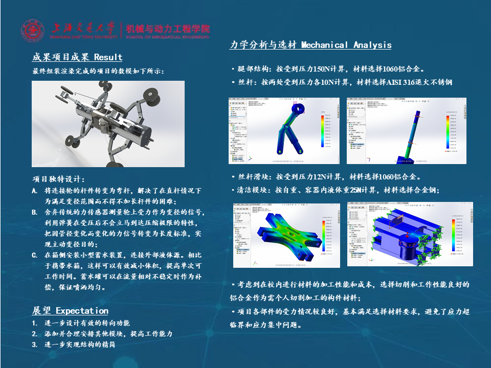 经过本学期的工作,本项目组针对上述目标完成了项目产品的设计,基于力学仿真与机构运动分析成功建立了机器人3D模型,并进行了渲染与运行仿真。