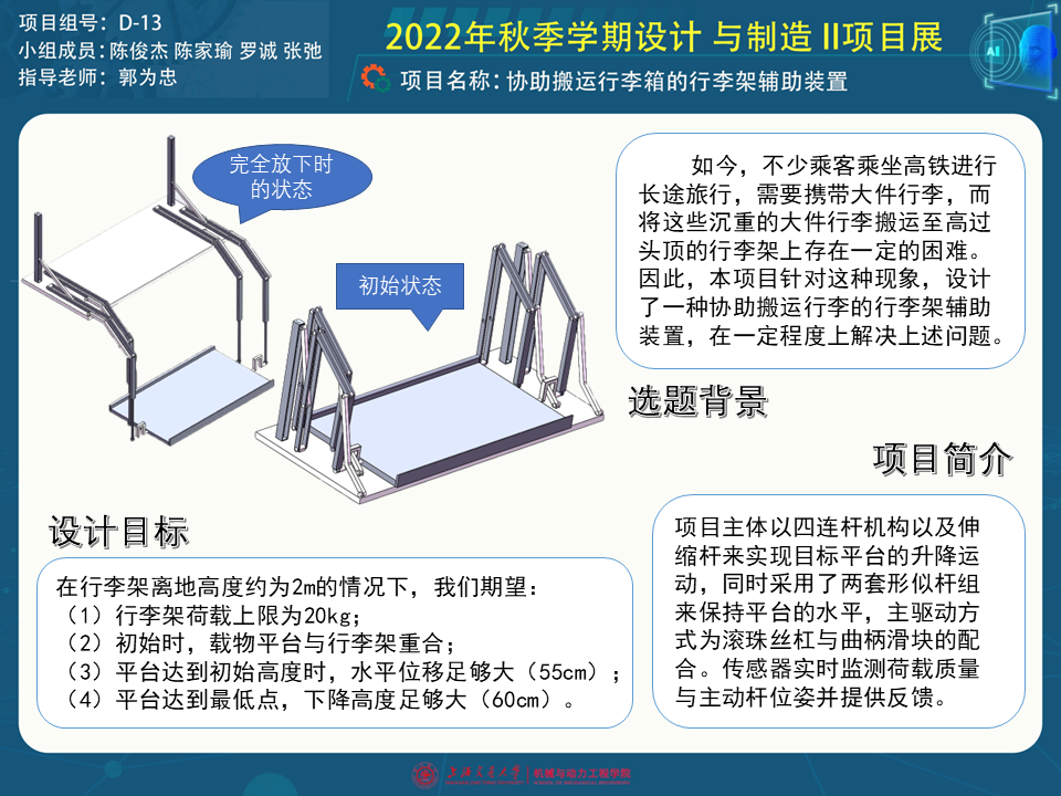 我们的项目名称为协助搬运行李箱的行李架搬运装置,项目主要基于目前高铁上行李架的位置过高,许多用户反映独立将行李箱放置在行李架上有较大困难,而高铁目前没有足够所有乘客使用的替代存放方案,因此我们打算基于设计与制造Ⅱ课程中学习到的基于连杆机构的结构设计方案,设计了一组驱动连杆与一个载物平台,能够实现在狭小的高铁行李架空间内,将重量在20kg以内的行李箱搬运至行李架上并取下,并辅以控制与测量反馈模块,构成一则面向实际的、便于用户使用的辅助搬运装置。