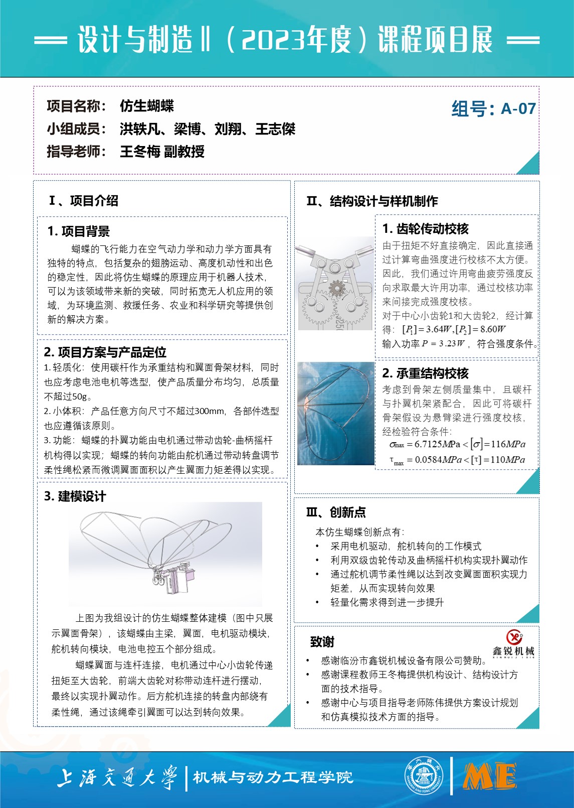 4. 详细结构设计:我们对电机模块的齿轮传动结构和曲柄摇杆机构进行了功能参数计算(扑翼角,升力等)和传动校核,同时对承重结构进行了强度校核,以上校核均符合预期结果。