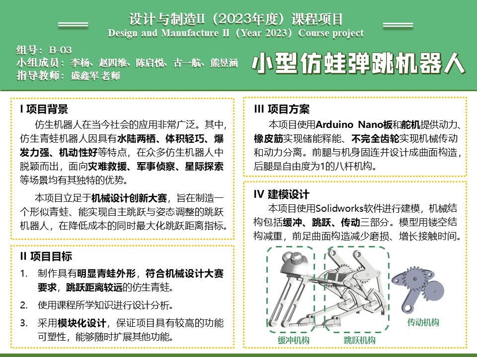 仿生跳跃是当下仿生机器人领域的热门话题,然而其机构的精巧性和控制的复杂性是所有研究者面对的难题。本项目立足于机械设计创新大赛,旨在制造一个外观形似青蛙、能实现自主跳跃、姿态调整的跳跃机器人。在降低成本的同时最大化实现跳跃距离指标。同时对机器人保留较高的可塑性和再设计空间,使其功能能够适应实际应用比如侦查、救援等场景。