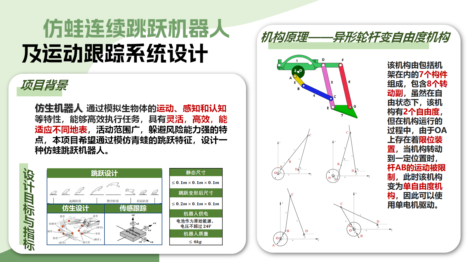 此外,为了提升仿生青蛙的性能,实现连续跳跃的目标,除机创赛规定的设计指标外,对于项目整体,我们还希望达到的目标有: