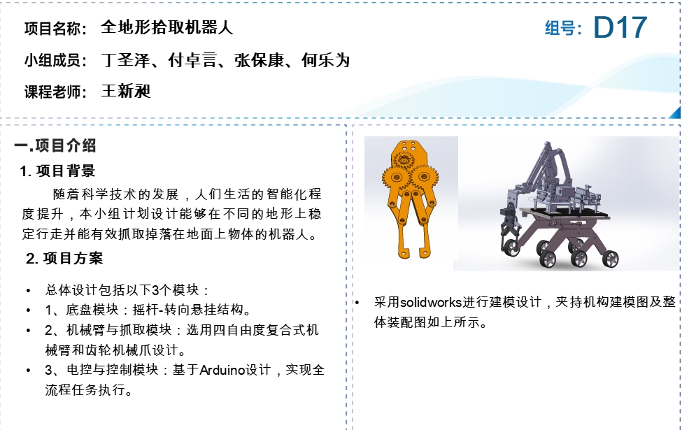 本项目致力于设计并开发一款多地形拾取机器人,其主要目标是实现机器人在多种复杂地形上的稳定移动与物品拾取能力。机器人以高效拾取地面散落的小物件(如易拉罐、小纸盒)为任务核心,通过底盘设计、机械臂系统和控制逻辑,使其能够适应多样地形,完成任务。