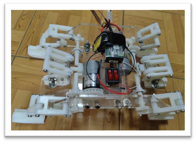 我们的最终设计是六足螃蟹状的越障机器人。它有六条腿,每条腿都是一个六杆机构。每三个支腿由电机控制,电机的动力由齿轮传递。我们设计了一个特殊的传动轴来传输动力,并确保中间腿的相位角领先其余两个腿 180 度。而根据我们的设计,每时时刻刻至少有三条机器人的腿在地面上。