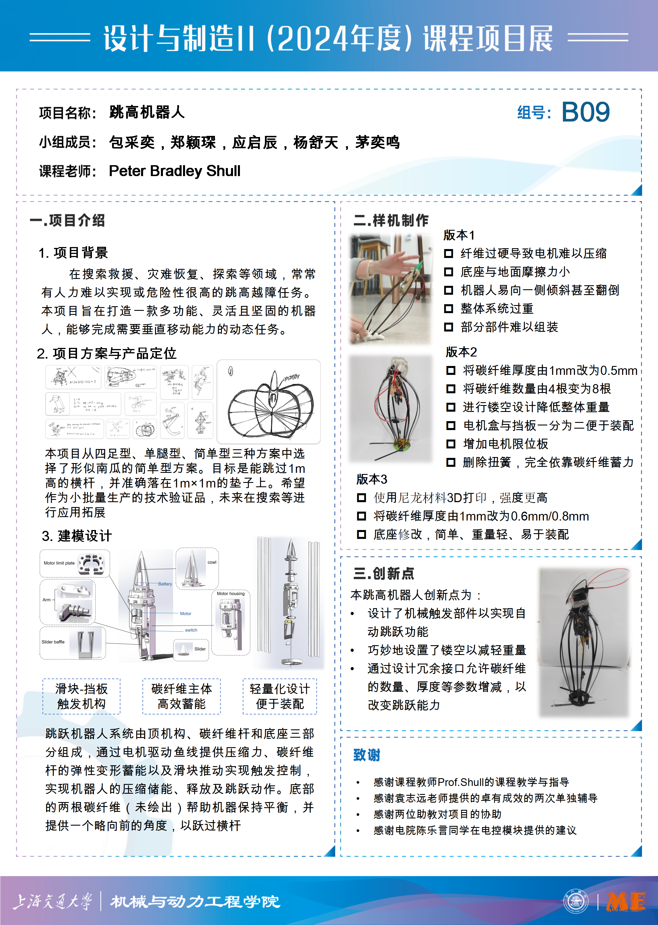 The Jumping Robot project aims to develop an agile robot capable of vertical movement for applications such as search and rescue, disaster recovery, exploration, and entertainment. The robot's design focuses on overcoming obstacles, navigating rough terrain, and accessing hard-to-reach areas. Key engineering specifications include a jump height sufficient to clear a pole, landing accuracy within a 1m×1m area, a setup time under 30 seconds, and a compact size. The Simple Jumper concept was chosen for its balance of performance and cost, featuring a system with motor and battery installation, carbon fiber rods for stability, and a base for support. The motor compresses the mechanism to store energy in the carbon fiber rods, which is released to initiate the jump. Specific parameters, such as the dimensions of the carbon fiber rods and the motor, were carefully selected for optimal performance. The manufacturing plan includes 3D printing the motor housing and base, with other components purchased and assembled. The design allows for easy assembly, through some improvements, like reinforcing the triggering mechanism and optimizing material choices, could enhance reliability. Overall, the project presents an innovative approach to robot design, offering flexibility and potential for further improvement in terms of efficiency and robustness.