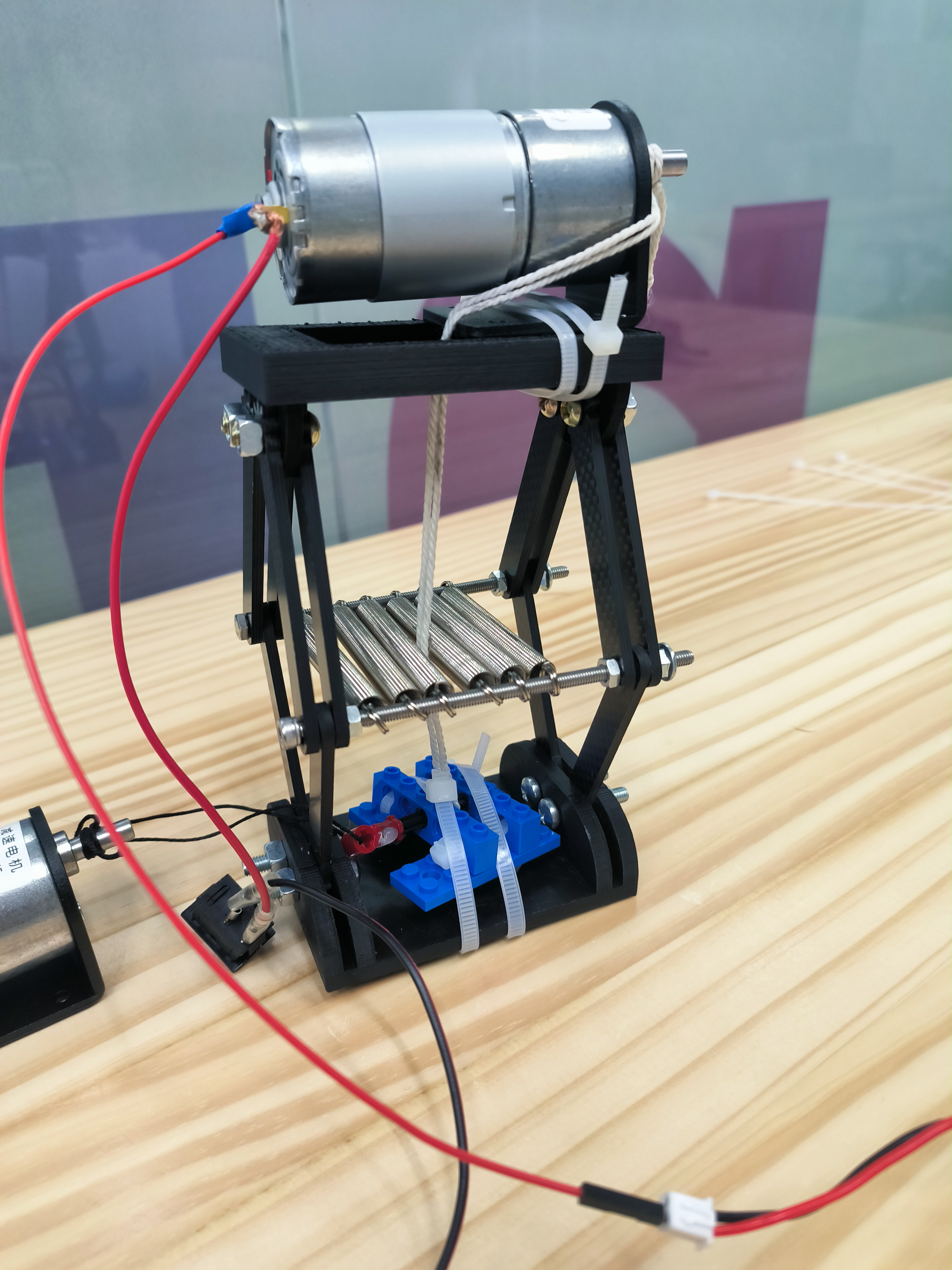 本项目为跳高机器人,使用弹簧作为能量储存机构,主体结合了连杆、齿轮组等机构的设计,使用多个电机驱动,能够实现跳跃以及控制起跳角度的功能,并通过电路设计实现了自动释放的功能。
