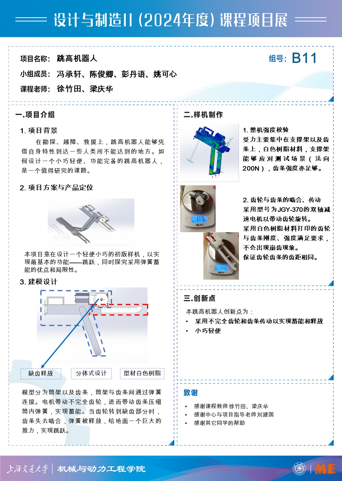 本项目意在设计一个轻便小巧的跳高机器人样机,以实现最基本的功能——跳跃,同时探究采用弹簧蓄能的优点和局限性。