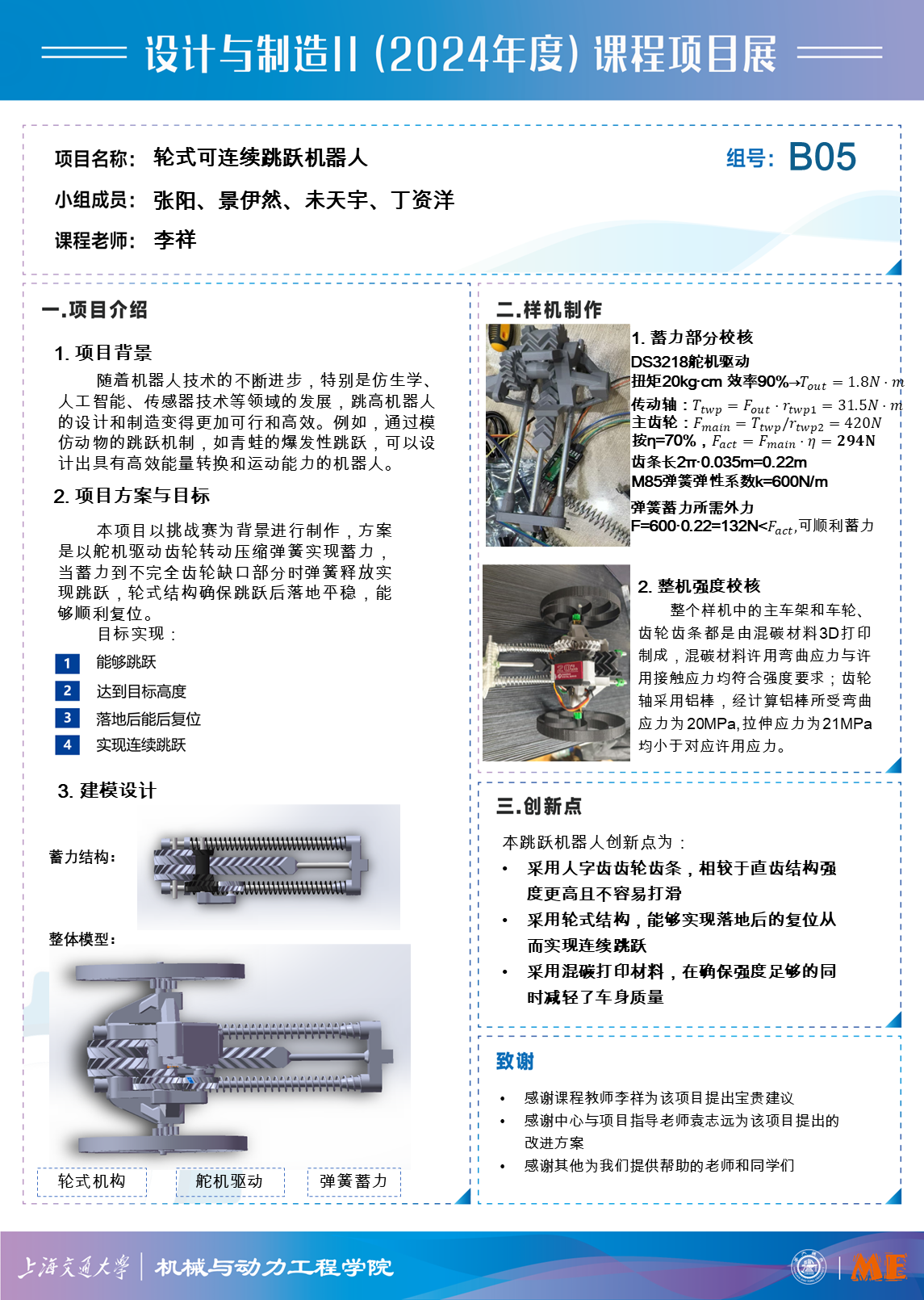 本项目以挑战赛为背景进行制作,方案是以舵机驱动齿轮转动压缩弹簧实现蓄力,当蓄力到不完全齿轮缺口部分时弹簧释放实现跳跃,轮式结构确保跳跃后落地平稳,能够顺利复位。